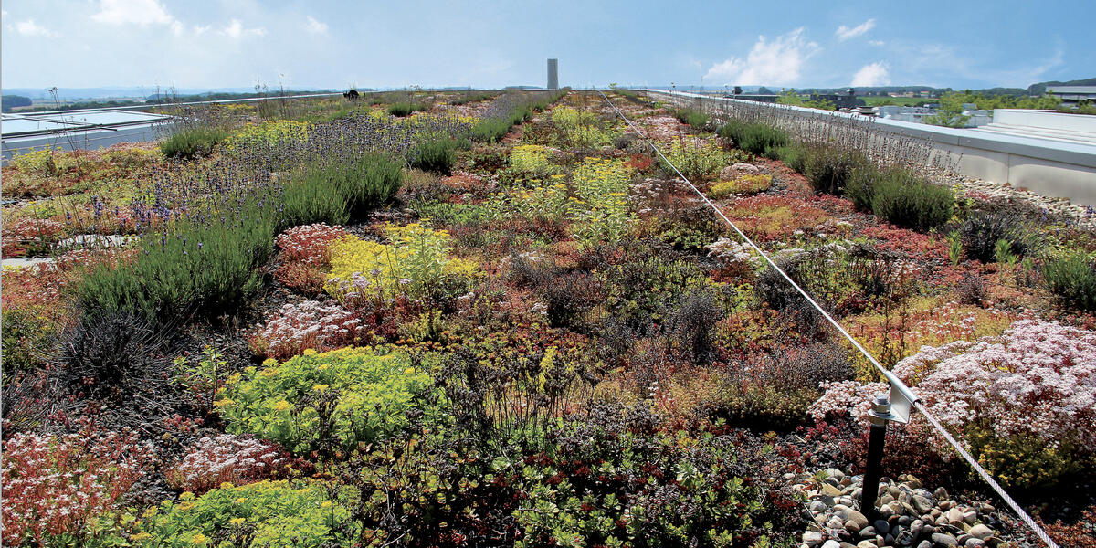 Um gerade in Ballungsgebieten den Folgen des Klimawandels wie Starkregen, Hitzestau und Trockenheit zu begegnen, kommt dem Grün in der Stadt eine wichtige Bedeutung zu. Dächer und Gebäude bieten hier ein großes, aber zu oft noch ungenutztes Potenzial. Begrünte Dächer und Fassaden wirken wie eine natürliche Klimaanlage. Sie speichern Regenwasser und können durch den Verdunstungseffekt die Umgebung abkühlen. Gründächer verlängern die Haltbarkeit eines Daches und bieten – neben anderen Vorteilen – nicht zuletzt auch neuen Lebensraum für Pflanzen und Tiere.