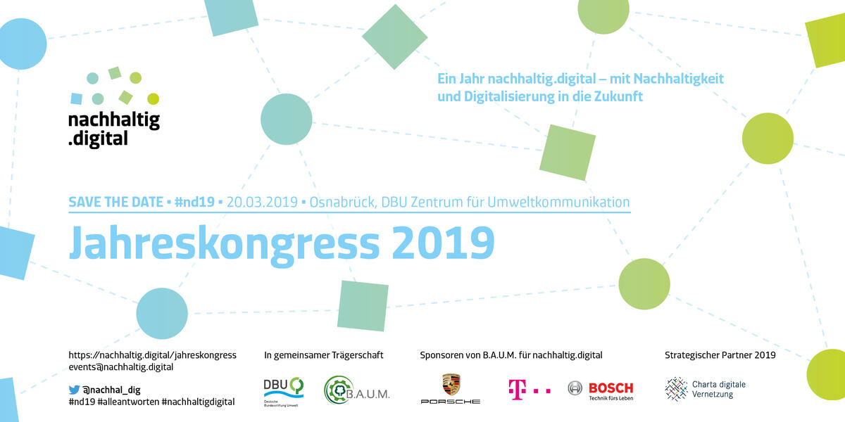 Der digitale Wandel bietet großes Potenzial, aber auch Risiken für nachhaltiges Wirtschaften. Wie können Unternehmen sich im digitalen Wandel fit für die Zukunft machen und gleichzeitig zu einer nachhaltigen Entwicklung beitragen? Antworten auf diese Frage präsentiert und diskutiert der Jahreskongress 2019 von nachhaltig.digital, der Kompetenzplattform für Nachhaltigkeit und Digitalisierung im Mittelstand von B.A.U.M. e. V. und DBU am 20. März 2019 von 10:00 bis 16:30 Uhr im DBU Zentrum für Umweltkommunikation in Osnabrück. Die Veranstaltung steht unter den Leitthemen »Künstliche Intelligenz«, »Messbarkeit« und »New Work« und untersucht, wie diese drei Themen in den drei unternehmerischen Dimensionen »People«, »Products« und »Processes« für eine nachhaltig.digitale Transformation genutzt werden können.