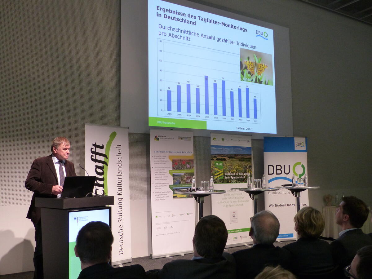 Warum kommt es zu einem Verlust der Biodiversität in der Agrarlandschaft und wie kann dieser Trend gestoppt oder, im Idealfall, umgekehrt werden? Dazu referierte der stellvertretende DBU-Generalsekretär Prof. Dr. Wahmhoff bei der Veranstaltung „Bauern brauchen Insekten – Insekten brauchen Bauern?!“ im Rahmen der Internationalen Grünen Woche. Neben konkreten Maßnahmen im Feld präsentierte Wahmhoff das von der DBU verfolgte Konzept der einzelbetrieblichen Biodiversitätsberatung. Dies basiert darauf, je nach Region bestimmte Schutzziele festzulegen und danach zielführende Maßnahmen durchzuführen. Als mögliche Finanzierungs- und Organisationslösung sprach er das in den Niederlanden praktizierte Modell der sog. „Cooperativen“ an. Dieses wurde in der abschließenden Podiumsdiskussion als sehr interessant und verfolgenswert eingeschätzt. Wahmhoff machte klar, dass ein erfolgreicher Insektenschutz bzw. Biodiversitätsschutz nur in Zusammenarbeit und unter der Federführung der Landwirte selbst zum Erfolg führen kann, da diese direkten Einfluss auf die Entwicklung der Biodiversität haben.