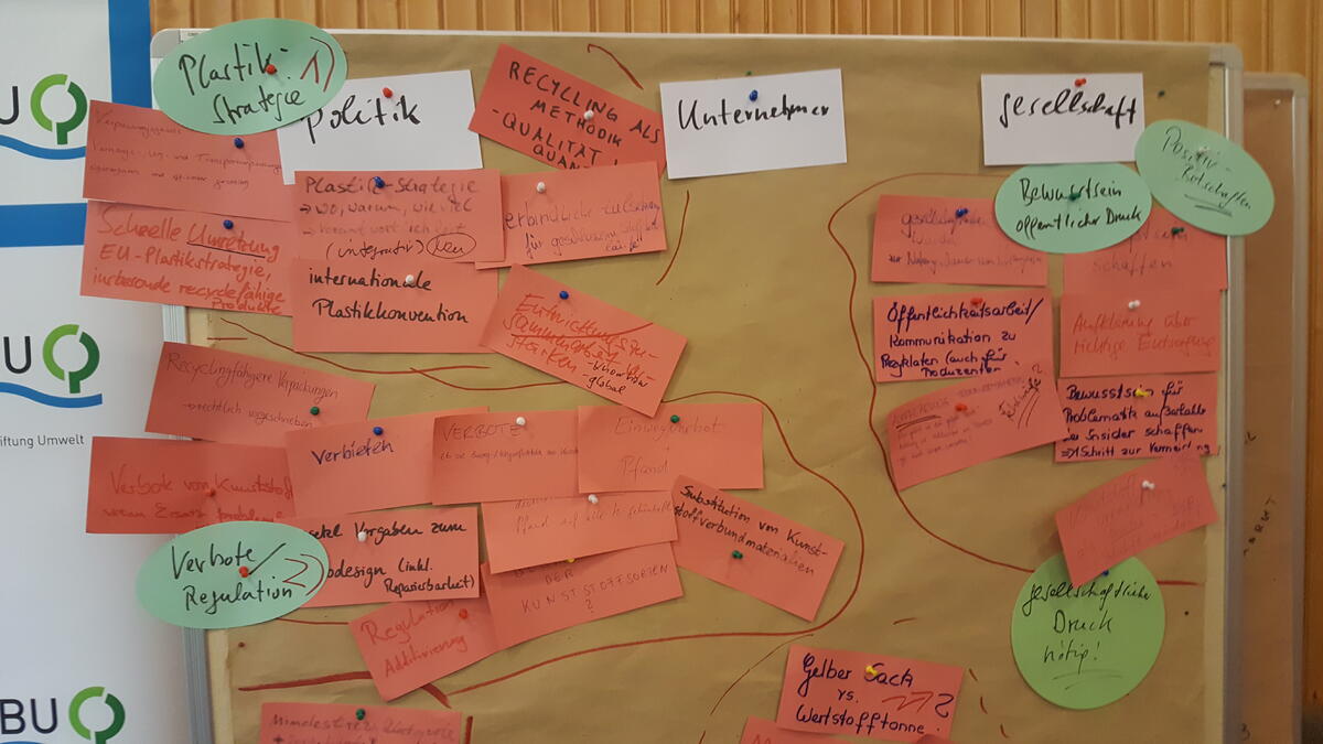 Nach den Vorträgen diskutierten die Workshopteilnehmerinnen und -teilnehmer, welche Geschäftsmodelle und politischen bzw. gesellschaftlichen Rahmenbedingungen nötig sind, um Kunststoff zirkular und ökologisch zu machen. Dabei wurden eine nationale Plastikstrategie mit klaren gesetzlichen Regeln und Zielvorgaben, beispielsweise eine Quote für den Recyklateinsatz, das Verbot von Wegwerfartikeln und öffentlicher Druck als vordringlich genannt. Darüber hinaus erarbeiteten die Teilnehmenden ein Projekt für Entwicklungsländer, bei dem der Erlös aus dem Sammeln und Recyceln von Plastikflaschen für den Trinkwasserfilter PAUL investiert wird.