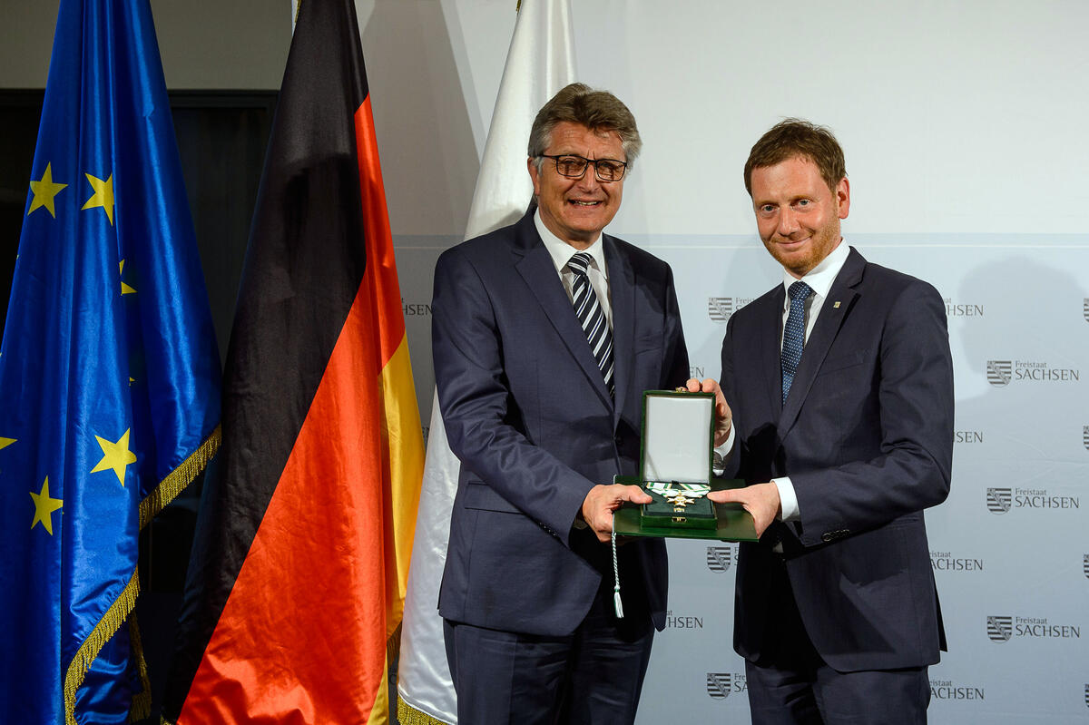 Der langjährige DBU-Generalsekretär, Dr.-Ing. E. h. Fritz Brickwedde, ist Anfang Juni mit dem sächsischen Verdienstorden ausgezeichnet worden. Ministerpräsident Michael Kretschmer würdigte die besondere Verbundenheit Brickweddes mit dem Freistaat und sein engagiertes Eintreten für den Umweltschutz in Ostdeutschland, wo die DDR immense Schäden an Umwelt und Natur hinterlassen habe. Brickwedde habe so die Schäden rasch zu beseitigen helfen und zugleich ein hohes Niveau beim Umweltschutz etablieren wollen, sagte Kretschmer.