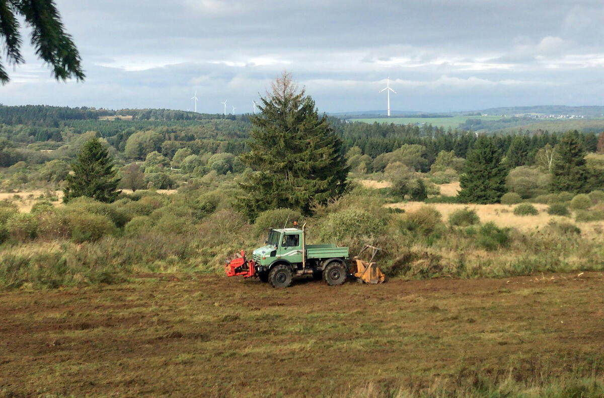 „Wir tun unser Möglichstes, um die arten- und blütenreichen Wiesen und Weiden am Stegskopf offen zu halten – trotz der möglichen Kampfmittelbelastung im Boden“, betont die Fachliche Leiterin des DBU Naturerbes, Susanne Belting. Damit die Flächen nicht verbuschen, habe der Landwirt in Zusammenarbeit mit dem Bundesforstbetrieb Rhein-Mosel Weiden und Ginster mechanisch entfernt und hierzu neben der funkgesteuerten Technik auch einen gepanzerten Schlepper eingesetzt.