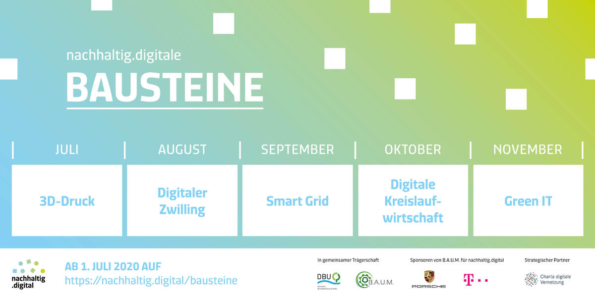 Bevor die Baustein-Sammlung als Gesamtpaket präsentiert wird, können Sie bereits ab Juli jeden Monat einen der nachhaltig.digitalen Baustein kennenlernen. Am ersten des Monats erhalten Sie Einblick in das jeweilige Prinzip und die Vorteile des Bausteins für Unternehmen. Im Verlauf eines Monats beleuchtet nachhaltig.digital verschiedene Aspekte eines Themas, jeweils donnerstags.