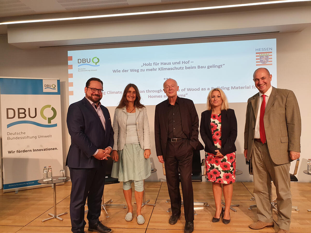 DBU-Generalsekretär Bonde hob hervor, welche zentrale Rolle das Bauwesen mit seinem enormen Rohstoff- und Ressourcenbedarf für die Zukunft spielt. So komme Holz als nachwachsendem Rohstoff eine besondere Bedeutung bei der nachhaltigen Transformation des Bausektors zu. Deshalb fördert die DBU unter anderem in der Hamburger Hafencity den Bau des höchsten Holzhochhauses Deutschlands. Das Einsparpotenzial durch die Nutzung des alten Gebäudebestands sei jedoch nicht zu vernachlässigen, betonte Sabine Djahanschah. Für ein klimaneutrales Bauwesen müsse „die umfassende Kreislaufwirtschaft zur Leitidee werden“.
