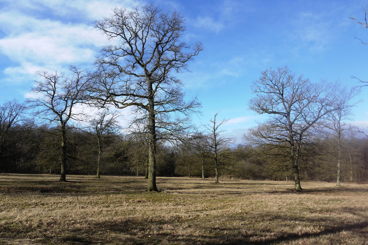 Einzeln stehende alte Eichen vermitteln ein romantisches Landschaftsbild. Das magere Grünland wird als Mähwiese genutzt und ist wertvoller Lebensraum für viele Insektenarten. © Biologische Station Kreis Paderborn - Senne