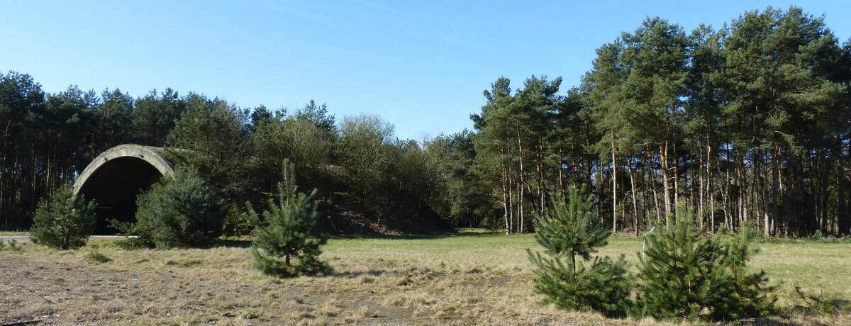 Zwischen der noch vorhandenen Infrastruktur (unter anderem Flugzeugshelter) befinden sich Kiefern-, Birken- und Eichenbestände, in die teilweise Sandtrockenrasenfragmente und Staudenfluren eingestreut sind. © Biologische Station Kreis Steinfurt e. V