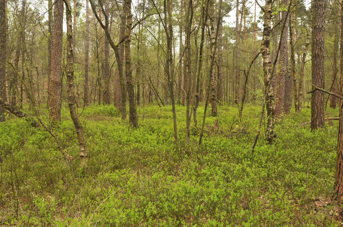 Im späten Frühjahr prägt das frische Grün der Heidelbeeren den Boden des Waldes. © Dietmar Ikemeyer, BS Zwillbrock