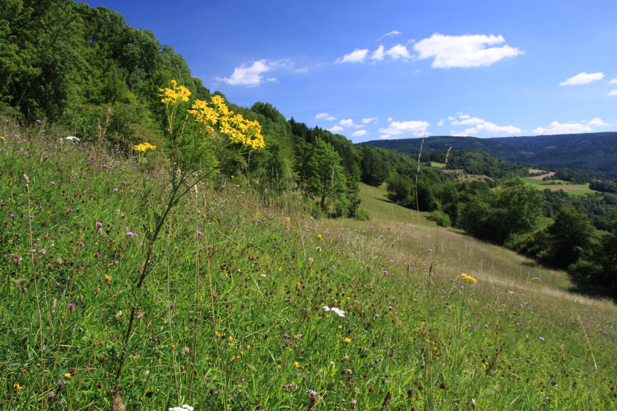 Offene Flächen, Hecken und Sträucher sowie Wälder bieten eine Vielfalt an Strukturen und somit vielen seltenen Tier- und Pflanzenarten einen Lebensraum. Im Vordergrund das Jakobs-Greiskraut (Senecio jacobaea). (Foto: © Markus Trommler)