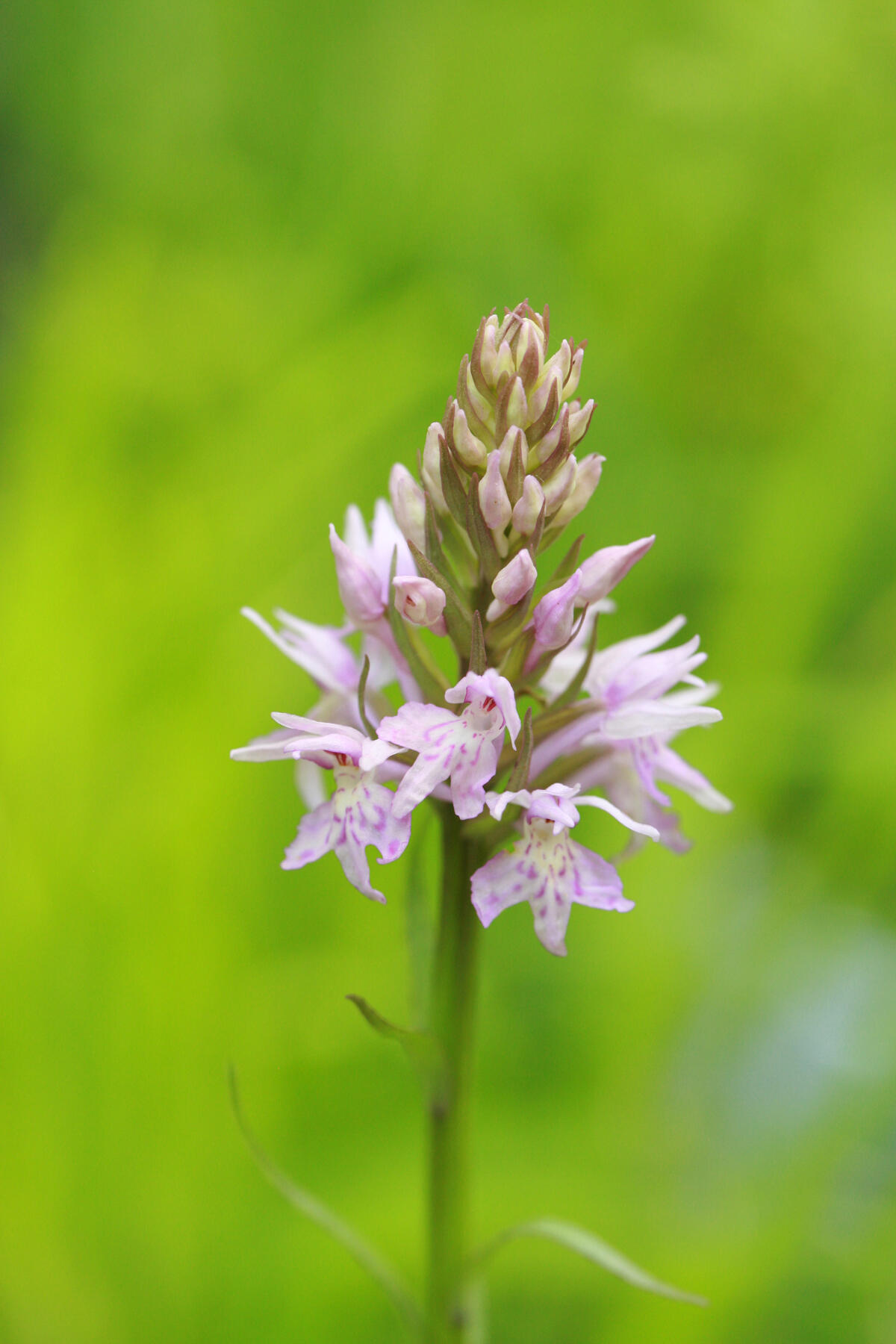 Das Fuchs‘ Knabenkraut (Dactylorhiza fuchsii) ist eine heimische Orchideen-Art und wächst auf frischen Wiesen. (Foto: © Dominik Poniatowski/DBU Naturerbe GmbH)