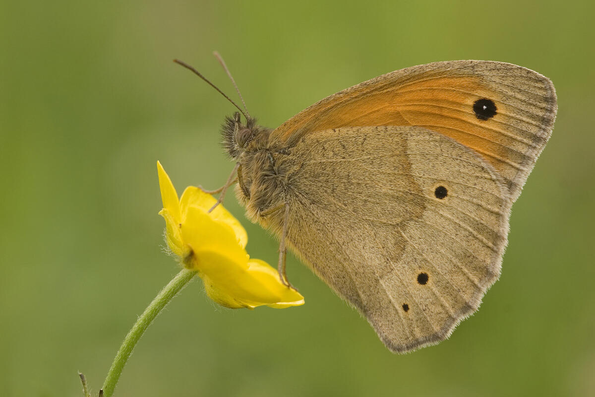 Das Große Ochsenauge (Maniola jurtina) hat eine relativ lange Flugzeit und ist von Juni bis September vor allem auf blütenreichen, mageren Wiesen zu beobachten. Die Falterart ernährt sich vom Nektar blütentragender Pflanzen und bevorzugt dabei violette Blüten. (Foto: © Jens Kolk / piclease)