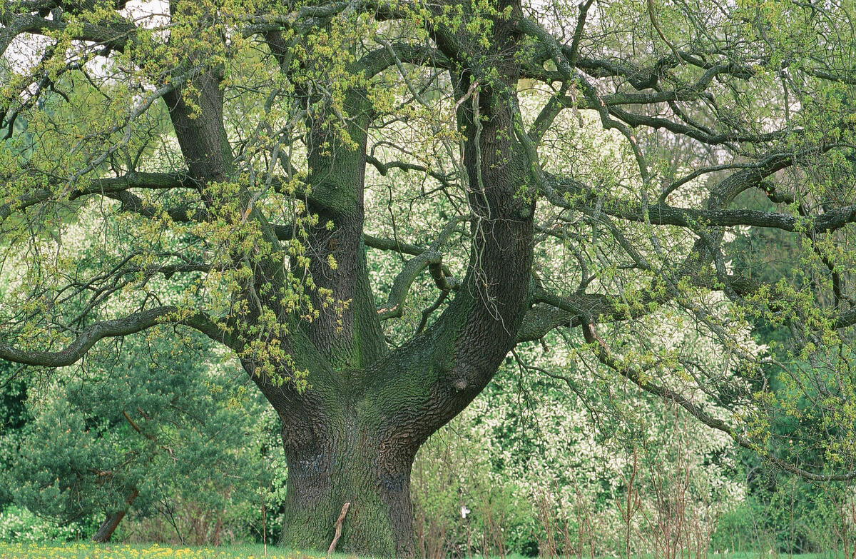 Dicke Eichen mit üppigen Baumkronen, teils über 200 Jahre alt, bieten seltenen Käfern wie dem Eremit und Vögeln einen Lebensraum.