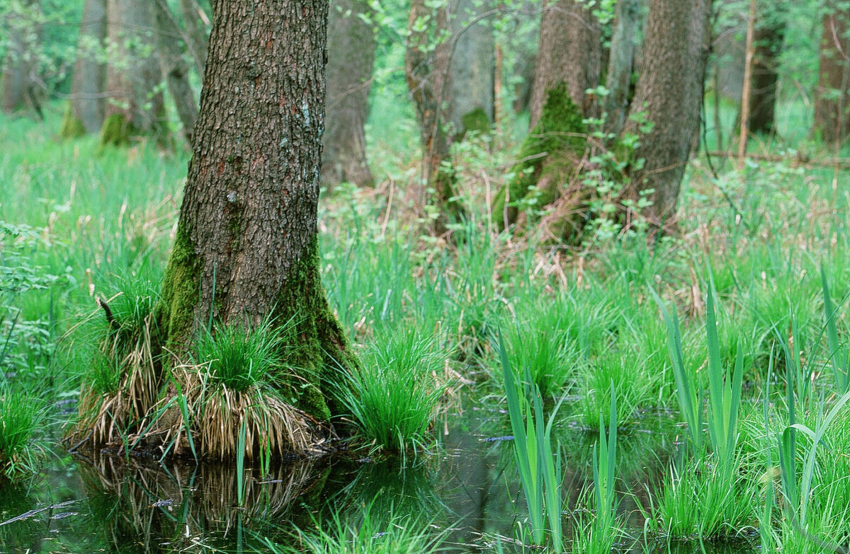 Die nassen, sumpfigen Erlenbruchwälder mit den typischen Schwarzerlen sind in Deutschland selten gewordene, wertvolle Lebensräume – etwa für die Gelbbauchunke.