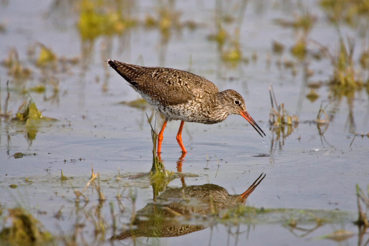 Der Rotschenkel stochert mit seinem langen Schnabel im flachen Wasser nach Würmern, Schnecken oder Krebsen. Mehrere Rotschenkel-Familien leben meist nahe beieinander.