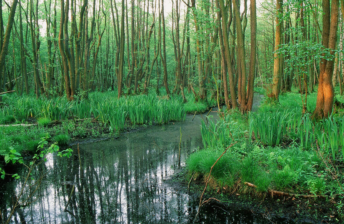 Die nassen, sumpfigen Erlenbruchwälder mit den typischen Schwarzerlen sind in Deutschland selten gewordene, wertvolle Lebensräume – etwa für den Moorfrosch.