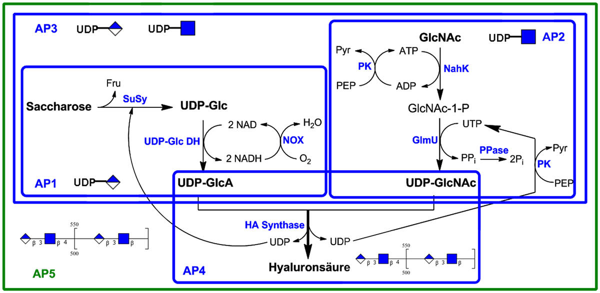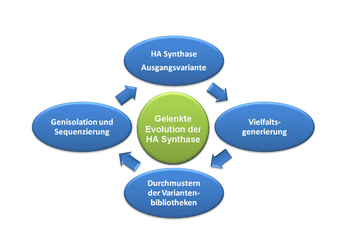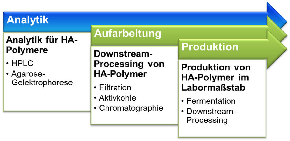 Im Verbundprojekt „HYALURONAN-Polymer“ (Bild 1) wird von den beteiligten Partnern der RWTH Aachen University (Biomaterialien, Biotechnologie, Angewandte Mikrobiologie) und der Fa. GALAB GmbH (Hamburg) ein solcher Prozess mithilfe eines mikrobiellen Wirts entwickelt. Vom ifu Institut für Umweltinformatik Hamburg GmbH wird das neu entwickelte Verfahren auf seine Nachhaltigkeit hin bewertet und existierenden Verfahren gegenübergestellt. Im Einzelnen werden neue Enzymmodule entwickelt, die eine schnelle und effiziente Bereitstellung der HA-Bausteine Glucuronsäure und N-Acetylglucosamin gewährleisten. Durch Protein-Engineering werden HA-Synthasen in ihrer Leistung, hochpolymeres HA zu synthetisieren, optimiert (Bild 2). Weiterhin werden Verfahren zur Analytik und Aufarbeitung von HA etabliert. Durch Kombination dieser Ansätze entsteht ein Verfahren zur fermentativen Produktion von langkettigen HA-Polymeren und integrierter Produktaufarbeitung zur Reduktion der Umweltbelastung. (Bild 4)