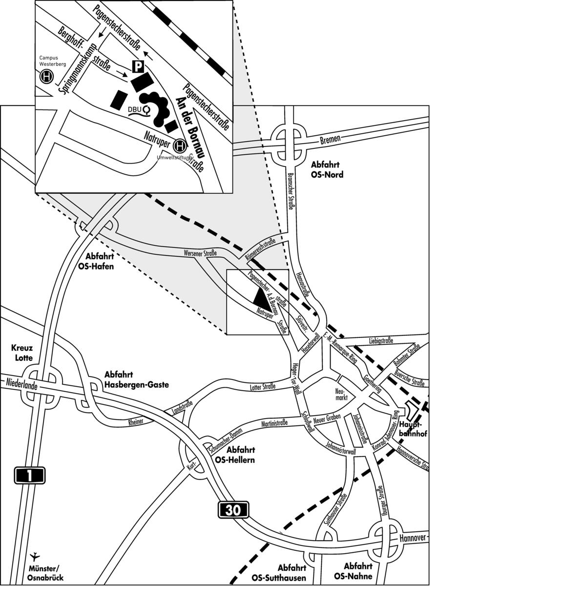 - Ab „Osnabrück Hauptbahnhof“ im 10-Minuten-Takt mit der Linie M2 direkt bis zur Haltestelle „Osnabrück Umweltstiftung". (Fahrtzeit 14 Minuten)